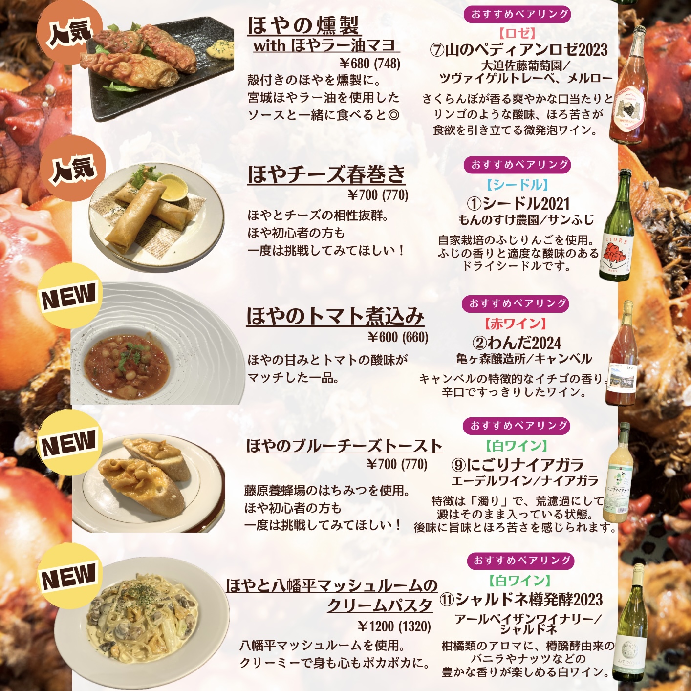 また、この日は花巻産ワインフェアの期間中のため、ワインに合わせたほや料理をご提供します🍷